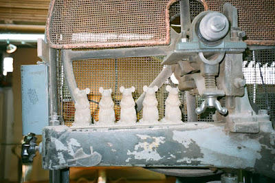Wooden mice on a piece of machinery.
