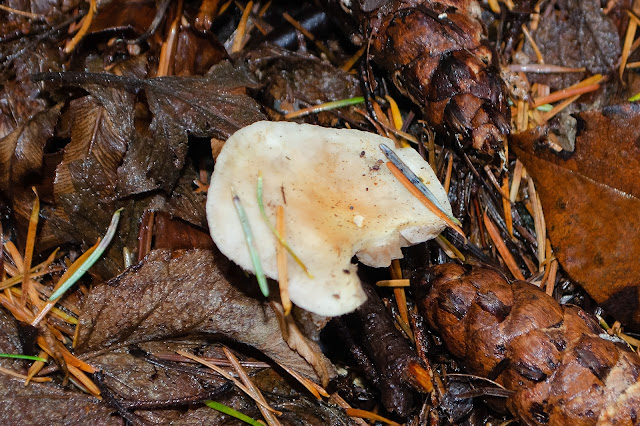 | Mushroom hiding under wet bigleaf maple leaves. |