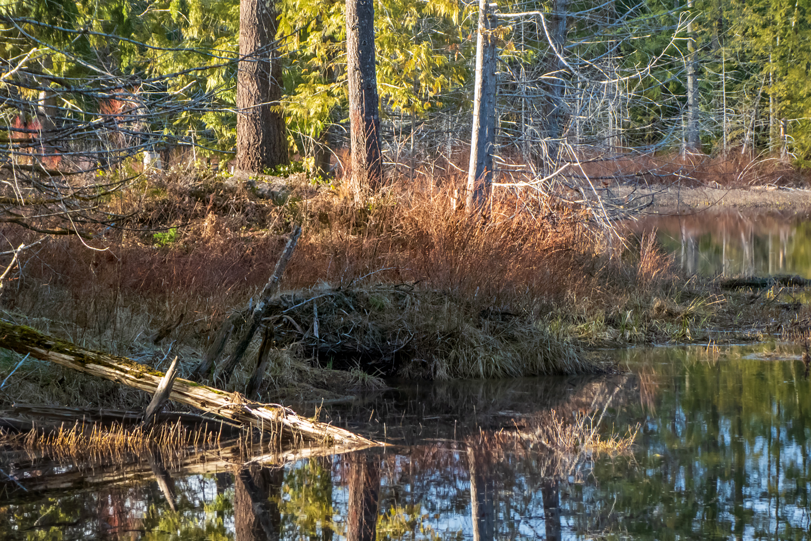 Later in the year, the beaver lodge is half hidden under new vegetation. Now, as the first green buds start to poke out of brown branches, it stands out clearly.