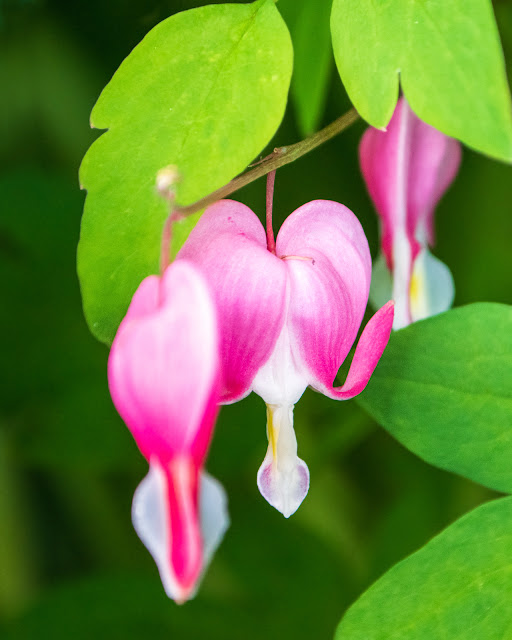 - Corazón sangrante, Dicentra spectabilis, alegrando la vista al lado de mi puerta. El corazón sangrante nativo es D. formosa, con flores más pálidas, más chiquitas.