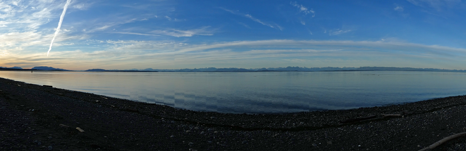 Ya que no he salido con la cámara, estoy revisando las fotos olvidadas del mes de junio. Y hay esto: una foto panorámica sacada desde la playa exterior de la bahía Oyster Bay, cerca de la puesta del sol. Se ve, desde la izquierda, las primeras casas de Campbell River, luego la isla Quadra, algunas islitas, y después las montañas del continente.