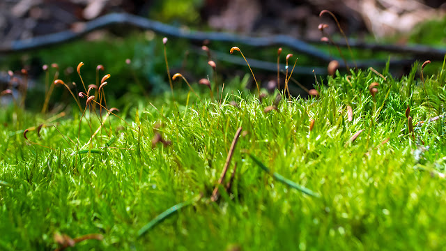 Es un buen lugar para observar los musgos y los líquenes. Y también los hongos. Y tal vez, espero, algún moho mucilanigoso otra vez. Mi cámara no está tan contenta con el sitio; demasiado oscuro, me dice. Pero en la tarde, cuando el sol ha bajado suficientemente como para colarse entre las ramas, baña un musgo u otro con un rayo pasajero.