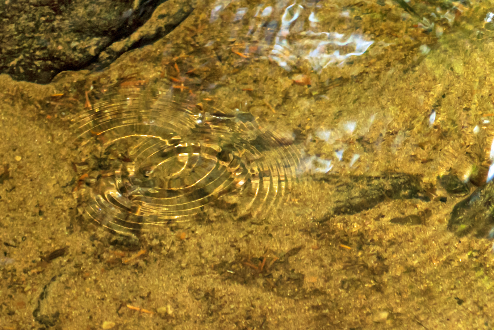 En este riachuelo, el agua está en movimiento continuo, así que lo que se puede ver son las onditas causadas por el empujón de las patas contra la tensión de la superficie.